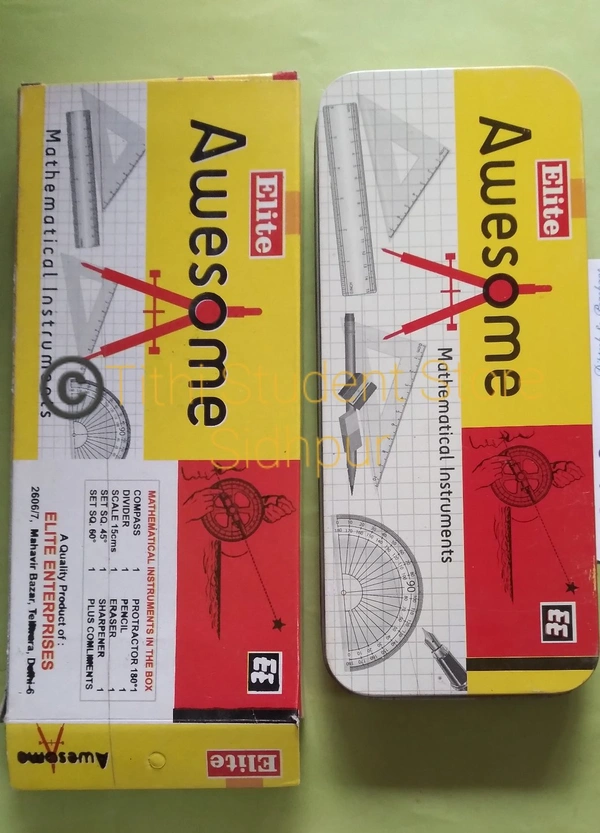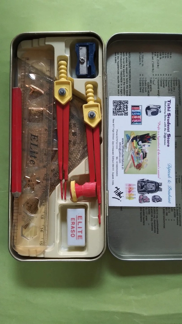 Strong durable box contains : compass,divider,set square 45 set square 60 scale 15cm,protector 180 pencil,Eraser,sharpner.