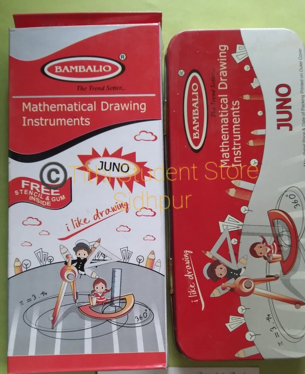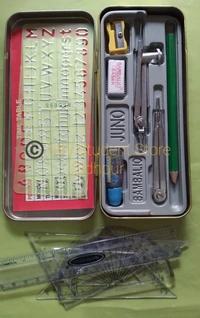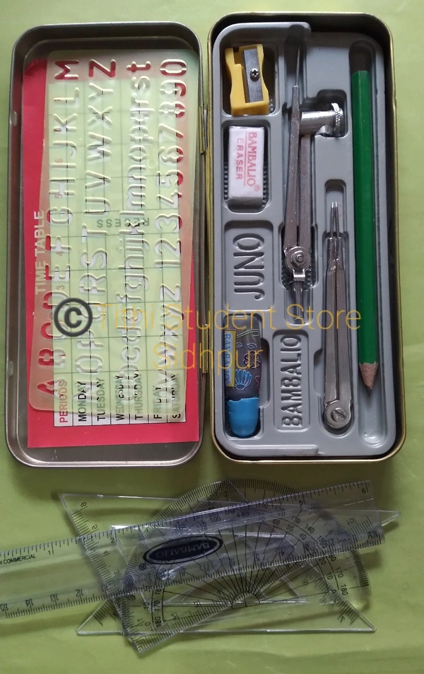 Strong durable box contains : compass,divider,set square 45 set square 60 scale 15cm,protector 180 pencil,Eraser,sharpner,Stancil and Time table.