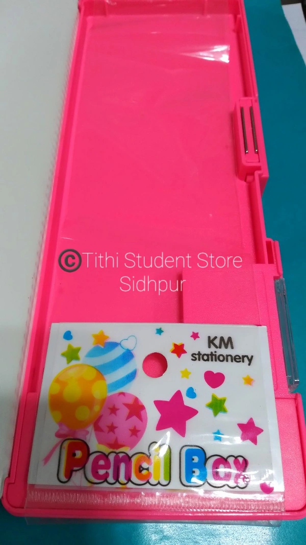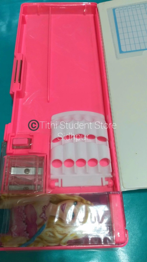 Attractive pink theme. Both the side printed.Both side compartment. Switch operated sharpner lead. Two Sharpner for long and short lead.