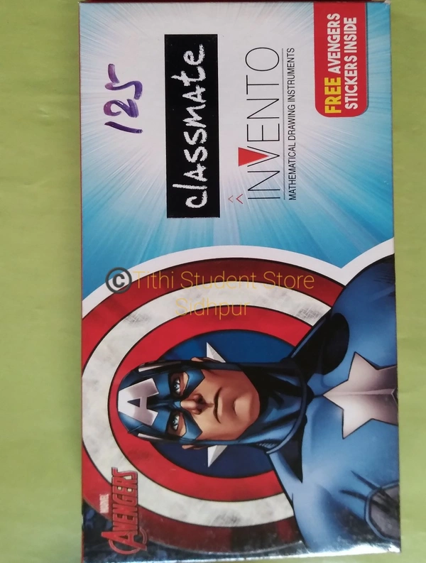 Strong durable box contains : compass,divider,set square 45 set square 60 scale 15cm,protector 180 pencil,Eraser,sharpner. Free : Avengers Stickers.
