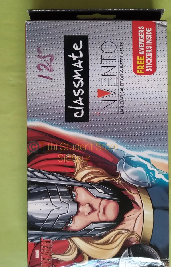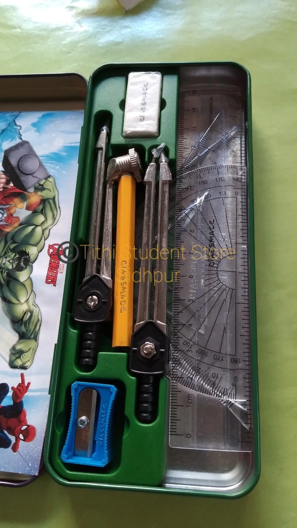 Strong durable box contains : compass,divider,set square 45 set square 60 scale 15cm,protector 180 pencil,Eraser,sharpner. Free : Avengers Stickers.