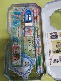 Strong Build, Attractive title design. Easily fit between books. Spacious box. Contains: Two pencil, One sharpner, One Eraser, One scale.