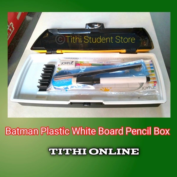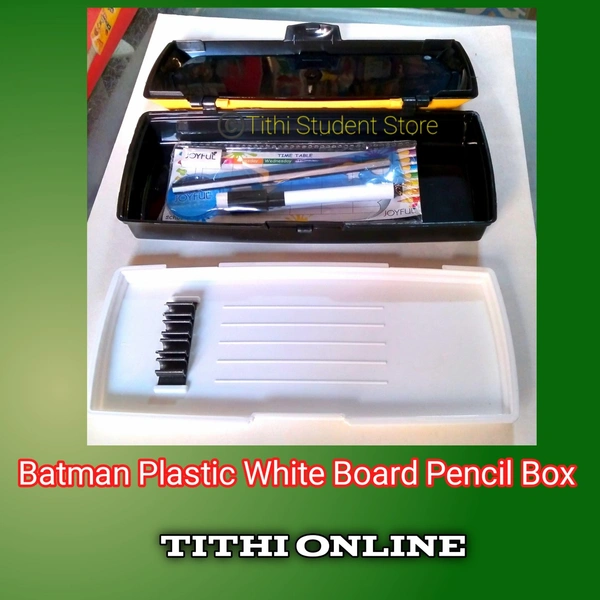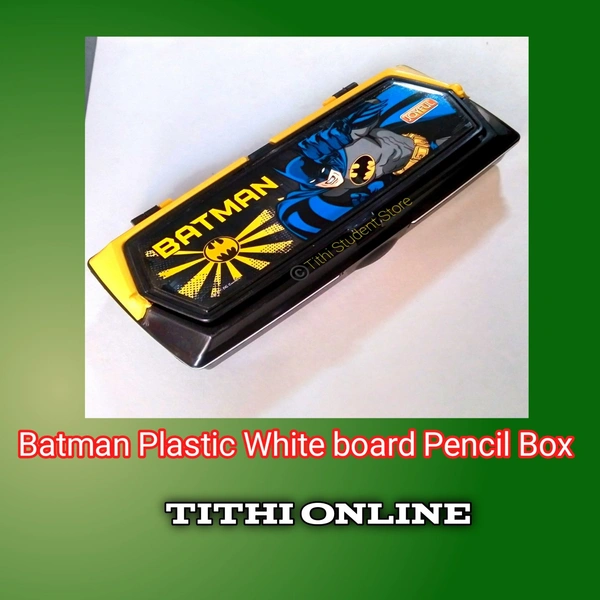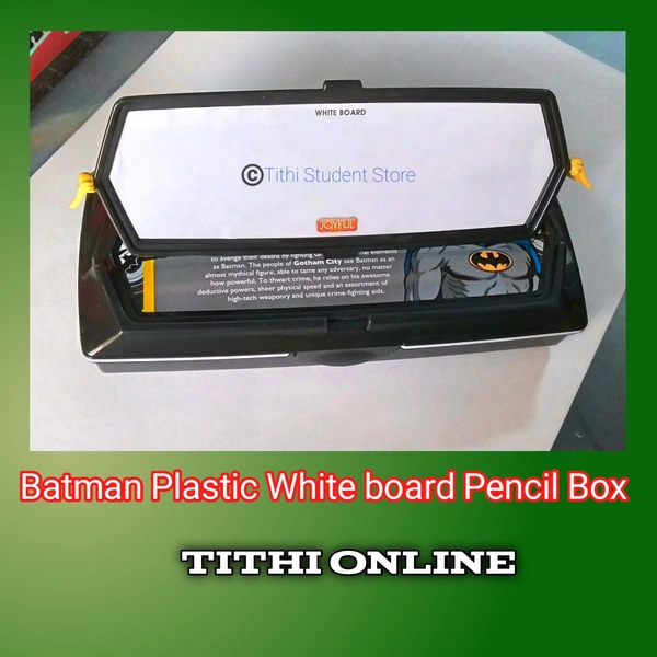 ☆White Board ☆ Pencil Organizer tray ☆ Big Main Compartment to accommodate all your school stuff ☆ Supreme Quality ☆ Locking systems to avoid sudden opening of box ☆ Attractive Batman Title ☆ Contains one pencil, Eraser, ruler and white board pen