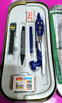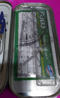 Durable box contains: compass,divider,set square 45 set square 60 protector 180,mechanical pencil, erase, sharpner and scale 15cm.